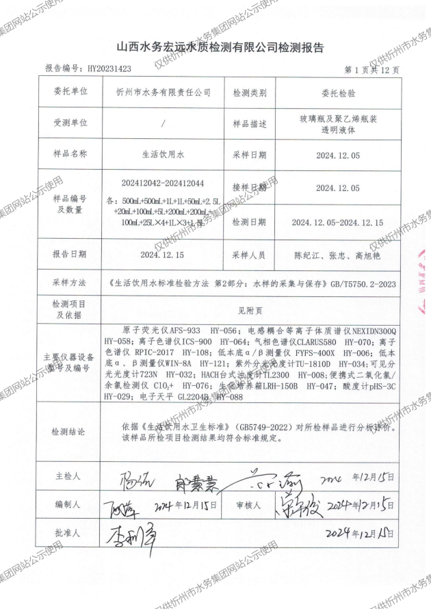 2024年忻州城區(qū)公共供水南水廠、三水廠、云中水廠出廠水97項(xiàng)水質(zhì)全分析